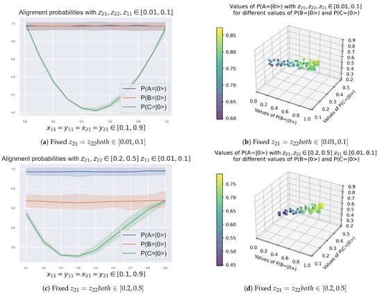 In the following case study we move on to simulate thousands of configurations of the parameters presented in the quantum circuit Equations (5) and (9) to understand those that provide a maximization of the alignment probabilities of agents B and C, , and , given by Equations (7) and (8) respectively. The circuits were simulated on a qiskit tool, a Python-based [33] quantum computing platform developed by IBM [34], and the code and additional results can be accessed in this Open Access Repository. We will evaluate these results in Section 4.