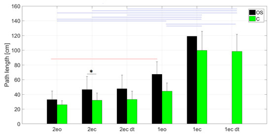 Path length values in subsequent trials for people with osteoporosis (OS) and the healthy group (C), where: * marks statistically significant differences between groups, the red line marks statistically significant differences between trials for OS group, and the blue line marks statistically significant differences between trials for the C group (p < 0.05).
