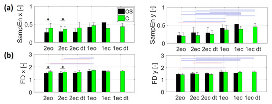 Coefficient values in subsequent trials for people with osteoporosis (OS) and healthy group (C): (a) sample entropy (SampEn); (b) fractal dimension (FD), where x—medio-lateral direction, y—anterior–posterior direction. * marks statistically significant differences between groups, the red line marks statistically significant differences between trials for the OS group, and the blue line marks statistically significant differences between trials for the C group (p < 0.05).
