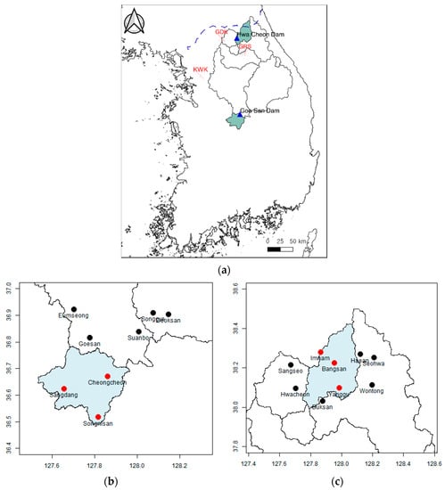 The location of radar equipment and gauged stations. (a) Study area and the location of radar. (b) Gauged stations in Goesan Dam watershed. (c) Gauged stations in Hwacheon Dam watershed.