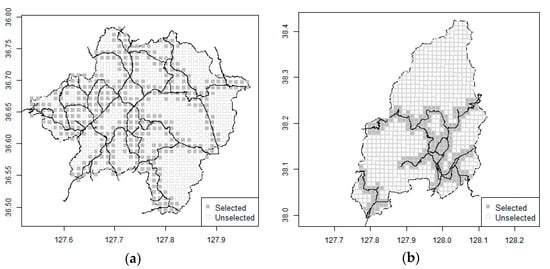 If rainfall stations are installed close to the road, cost for additional installation and maintenance can be reduced. Considering ease of access, only locations within radar grids around the road were selected (Figure 2). In the Goesan Dam watershed, 419 of the 691 grids or 60.6% of the grids, are close to the road. For the Hwacheon Dam watershed, 268 out of the 938 grids were selected, representing only 28.6% of the grids.
