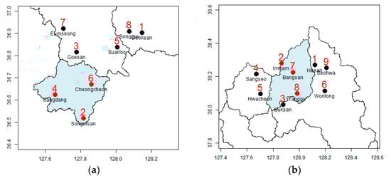 Results of the location of additional rainfall stations in the Goesan Dam watershed. (a) Proposed gauge sequence. (b) Proposed gauge sequence considering road.
