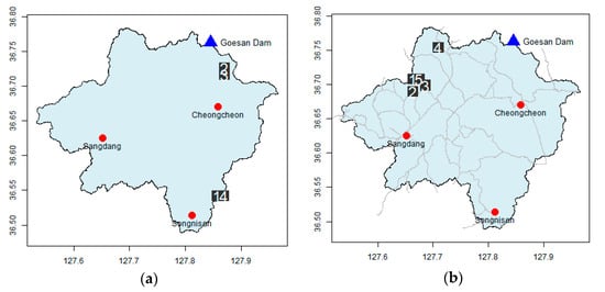 The standard node link is an electronic traffic map developed for more efficient management of the collection and provision of traffic information, to improve the accessibility of traffic information []. The standard node link contains information such as the class of the road, speed limit, and intersections on the road on which vehicles travel through the nodes and links. In this study, it was used to identify the geographical location of roads in the watershed. As of September 2019, the Hwacheon Dam watershed is represented by 334 links and 32,911 pieces of location information and the Goesan Dam watershed is represented by 605 links and 63,824 pieces of location information.