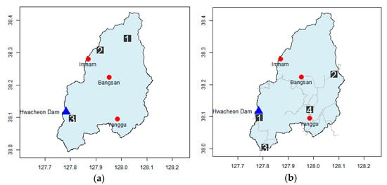 Results of the location of additional rainfall stations in the Hwacheon Dam watershed. (a) Proposed gauge sequence. (b) Proposed gauge sequence considering road.