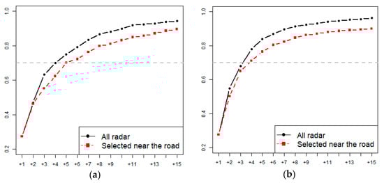 Compared to Table 3, which shows the results for additional stations selected using radar data, the efficiency is slightly lower, but lower installation cost and easy maintenance are the advantages in this case. If the entropy reduction is set to approximately 70%, five additional rainfall stations need to be installed for the Goesan Dam watershed (70.1%) and four additional rainfall stations for the Hwacheon Dam watershed (71.1%). The number of additional rainfall stations is increased by one compared to the method described in Section 4.2, but if the installation of the additional station is economically viable, this method that uses the road network for the selection of additional rainfall stations would be appropriate.