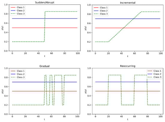 where defines the joint distribution at time between the set of input variables and the target class y. Thus, in a classification problem, the drift in Equation (1) may happen due to class priors , or class conditional probabilities (likelihoods) .