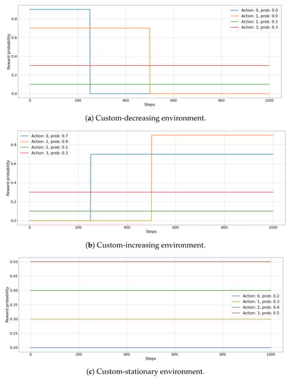 In the second scenario, called custom-increasing Figure 2b, we analyze the case of a data streaming where a sub-optimal action suddenly increases its expected value of reward, becoming the best solution, while others stay unchanged. Thus, the agent has to explore other arms to find the new optimal solution. Here, the initial reward distribution parameter for the four arms (Action 1, Action 2, Action 3, and Action 4) is set to respectively. After 250 steps the expected reward for Action 1 increases to and after 500 steps the expected reward for Action 2 becomes .