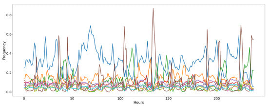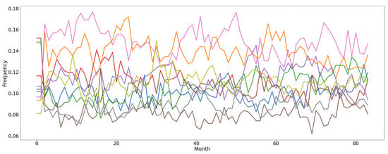 The Baltimore Crime (https://data.baltimorecity.gov/search?q=crime%20data, accessed on 22 March 2021) dataset is about the crimes committed in the city of Baltimore (US), between 2014 and 2020. The dataset includes various features of the reported crime, such as the weapon used, the type of crime and its location. The monthly distribution of the crimes in the 9 city districts is depicted in Figure 3. Each function represents the crimes frequency in a specific city district, through the months. It may be noticed that some variability exists in the data, which exhibits few (gradual) concept drifts. Nevertheless, the fluctuations in the data streaming are much closer to some random noise than to actual concept drifts, as they are defined in the literature and represented in the artificially-generated environments.