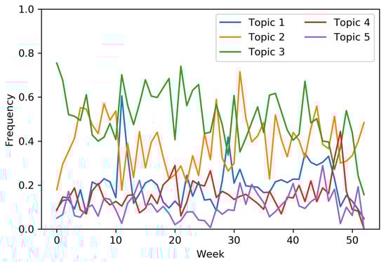 Together with each news article a snippet of the news content was provided. Therefore, we were able to apply a Latent Dirichlet Allocation (LDA) topic model [], to extract 5 topics from the article corpus. Hence, each article was represented by a probabilistic distribution over the topics. We binarize the topic representation of each news article by retaining those topics with a relevance of above 10% for that article. Hence, an article could be mapped to more than one topic. The relative frequency of the topic interactions (and thus the drifting concepts) through the weeks is represented in Figure 5. From the graph, it could be easily noticed how concept drifts affect this data stream, that is, the sudden drift of Topic 1 after the 10th week and the gradual drift of Topic 2 distribution between the 20th and the 30th week. Nevertheless, some other topic distributions show an evolution that is more similar to a stationary behavior with some noise variance (i.e., Topic 3 and Topic 4). We apply the MAB approach to construct a non-personalized recommendation system for the news topics. Namely, at each time step (i.e., user interaction) we select a topic to recommend to the user; each topic is mapped to an arm choose by the MAB algorithm. If the selected arm corresponds to one of the topics associated to the article the user interacted with, a positive reward of 1 is provided, 0 otherwise.