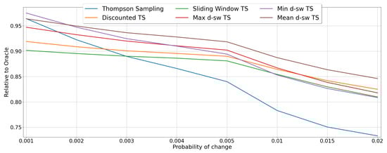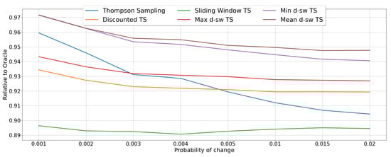 Firstly, we test f-dsw TS in randomly-generated environments, where the initial payoff probability for each arm is random and the drift probability is fixed. In this setting, each arm has a random initial reward distribution; the parameter of the Bernoulli reward distribution for each arm k is uniformly-sampled in . Then, at each time-step t, each arm k has an independent drift probability of changing its reward distribution to a new Bernoulli distribution with uniformly-sampled parameter . We set the number of classes (arms) to four and the number of time-steps to 1000, for every randomly-generated environment. For experimental purposes, we define a random scenario as a set of 1000 randomly-generated environments, with a fixed drift probability d and a fixed drift type (as defined in Section 2). The results for a random scenario are computed as the average results over each randomly-generated environment in that scenario. We propose a comparative evaluation of the MAB algorithms in different random scenarios. Specifically, we consider the following set of drift probabilities: and the two main types of concept drift, namely abrupt and incremental.