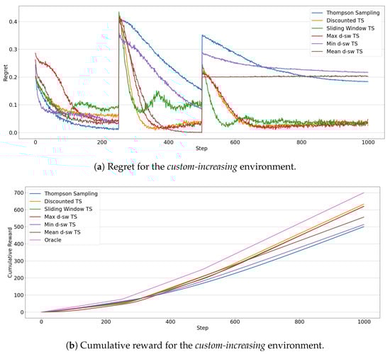 Results of the MAB algorithms in the custom-increasing environment. Line plots represent the regret (a) and the cumulative reward (b) through 1000 steps for each algorithms.
