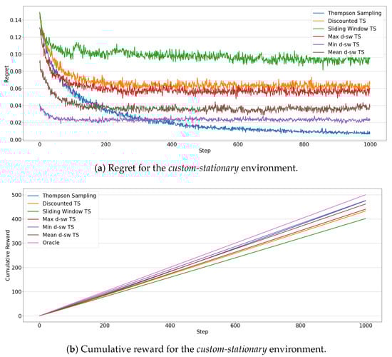 Finally, Figure 11 shows the results for the custom-stationary environments, that is, when the reward distributions do not change over the time, for example between two changes. The agents that achieve the best cumulative reward (Figure 11b), are min-dsw TS and, as expected, the original version of Thompson Sampling, due to the fact that this stationary algorithm does not spend time to explore the environment when it has already tried all arms enough times. The analysis of the regret in Figure 11a shows that min-dsw TS is the fastest to find the best arm and then it achieves a lower regret during time compared to all other non-stationary algorithms. Contrary to custom-increasing environment, max-dsw TS and Discounted TS perform worse than other algorithms, while Sliding Window is the worst in this scenario. The mean-dsw TS achieves, as expected, average results compared to the other competing algorithms.