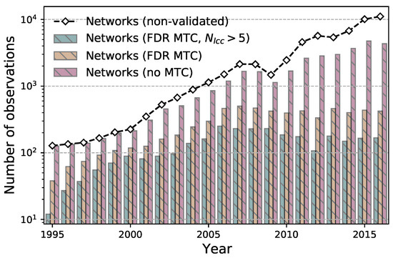 The number of security-specific networks in a given year with a different link validation: (i) Networks with at least one non-validated link (black curve with diamond-shaped markers), (ii) networks with at least one link with a p-value lower than (red bars), (iii) networks with at least one link remaining after the false discovery rate (FDR) multiple test correction (MTC) was applied (yellow bars), and (iv) networks with more than five nodes in the largest connected component after the FDR MTC was applied (green bars). See also Table A1 in the Appendix A.