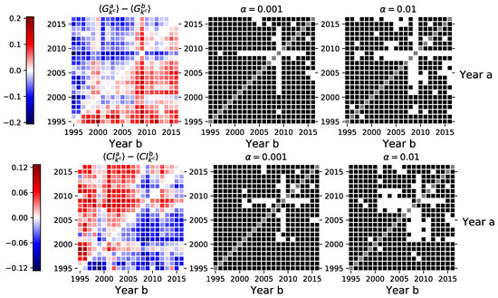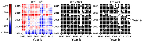 The left-hand side of Figure 2 shows the differences between the average number of links L observed between different years. The same heat map can represent the density and average degree , though on a different scale (not shown in the figure). That is, all three measures are linearly dependent on the number of links in the network, yet scaled differently (see (3) to (5)), for which reason we report results only for the average number of links. From the figure, we can see that the network connectivity peaked in 2008–2009 with more links on average (higher density and average degree) than observed in other years. Moreover, when comparing the means of the annual network features that are calculated for the securities with existing networks in both compared periods, we can see that the years 2008–2009 particularly stand out as with only a few exceptions, we rejected the paired t-test null hypotheses between the ones observed in those years and the ones observed between 2001 and 2016.