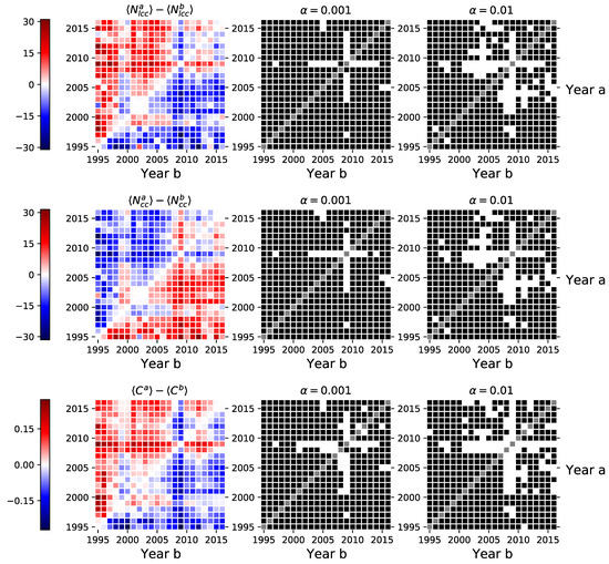 where is the mean of a particular network feature f observed in year a. The ■ in the figures indicates for which pairs of periods we have failed to reject the null hypothesis (the means are equal), and the □ indicates for which pairs of periods we have rejected the null hypothesis in favor of the alternative (the means are different) with (e.g., see Figure 2). Moreover, each figure is accompanied by a heat map to visualize the differences between the sample means in different periods. The color of each cell encodes the difference between the mean value of a feature observed in the year indicated in the y-axis and the mean value of the year indicated in the x-axis.