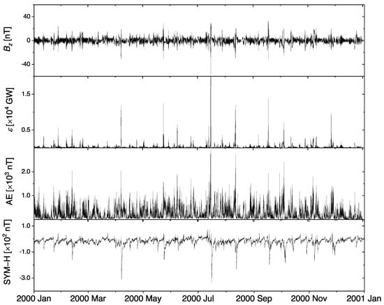 In this work, we focus on the year 2000 (from 1 January to 31 December), which corresponds to the maximum phase of solar cycle 23. In fact, this chosen time span consists of a number of geomagnetic storms and substorms, as observed in Figure 1.