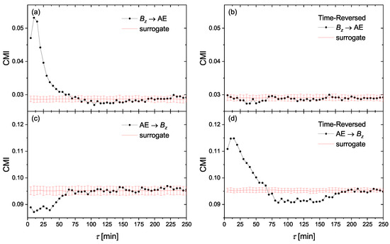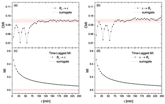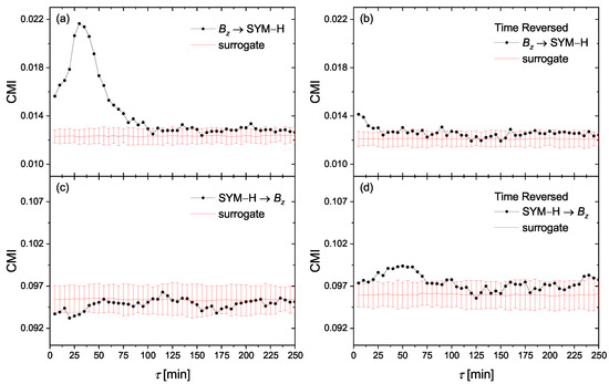 The conditional mutual information (CMI) of Equation (13) for the information flow directions of (a) SYM-H, (c) SYM-H . (b,d) are, respectively, the same as (a,c), but for time-reversed series.