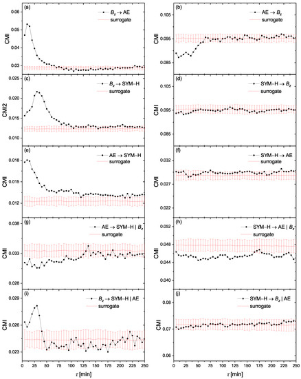 The conditional mutual information (CMI) (Equation (13)) obtained from the time series of , AE and SYM-H, for the information flow directions of (a) AE, (b) AE , (c) SYM-H, (d) SYM-H , (e) AE → SYM-H, and (f) SYM-H → AE. (g,h) are the information flow directions similar to (e,f), by taking as the third variable into the condition (see Equation (18)). Analogously, (i,j) are the information flow directions similar to (c,d), by taking AE as the third variable into the condition. The red lines and error bars present mean and standard deviations of CMI for a set of circular time-shifted surrogates.