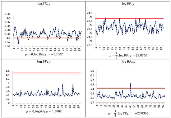 Now, our new estimators of the Bayes factors will be used. We start with the assumption that the subset D is an intersection of the subspace of parameters and latent variables, obtained by the condition that the ratio of conditional density functions and is between the lowest and the highest values of the ratio evaluated at pseudo-random sample in both models, and the hyper-cuboid limited by the range of the sampler output, i.e., , where