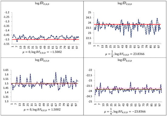 Estimates of the log Bayes factor in the Student t model, obtained with the use of the new estimators (blue line), and of the corrected arithmetic mean estimator after having integrated out latent variables (red line). Simulation study of the Student t model using 1000 simulated data points (, which is also equal to the number of latent variables); 20,000 Gibbs sampler iterations for estimation were used. The symbol denotes corrected estimator of the Bayes factor in favor of model against model . The symbol denotes corrected estimator of the Bayes factor in favor of model against model .