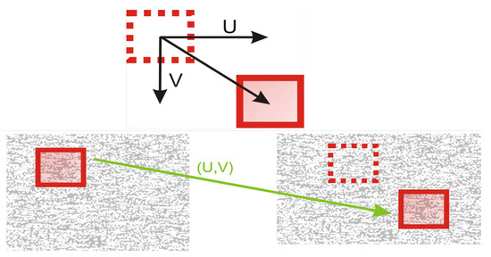 The technique of digital image correlation is used for measuring displacements of textured objects. One image from the series is selected and it represents a reference picture for all subsequent analyses. Then it is divided into small rectangular regions (called subsets) containing N × N pixels (Figure 1). Subset size depends on the size of the random pattern, but also on its quality. Position of subsets is tracked from the reference picture to all other pictures from the measurement series. Cross-correlation coefficient calculation is used to search subsets positions. The displacement vectors U and V are calculated for every subset (Figure 1). Subpixel accuracy is achieved with the use of advanced interpolation methods, including Newton-Raphson method. This method is used to increase the accuracy of tracking, but also to speed up the process. At the beginning, it had extremely big computational costs, however, in recent years, scientists have been working on improving this algorithm, by removing its unnecessary parts. Thanks to their endeavors Newton-Raphson algorithm has become faster, and at the same time requires less computing power. This approach is a gold standard for detection of subpixel movement. The use of the Newton-Raphson algorithm during analysis improves the efficiency of the entire process. Set of displacement maps is obtained as a result, and therefore it can be used for deformation maps computation [14,15].