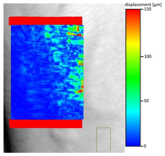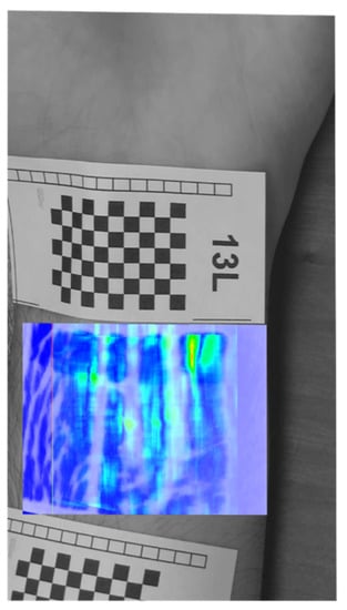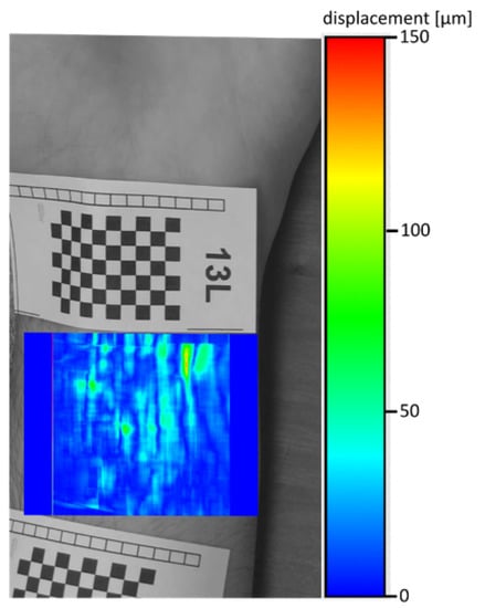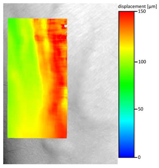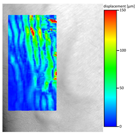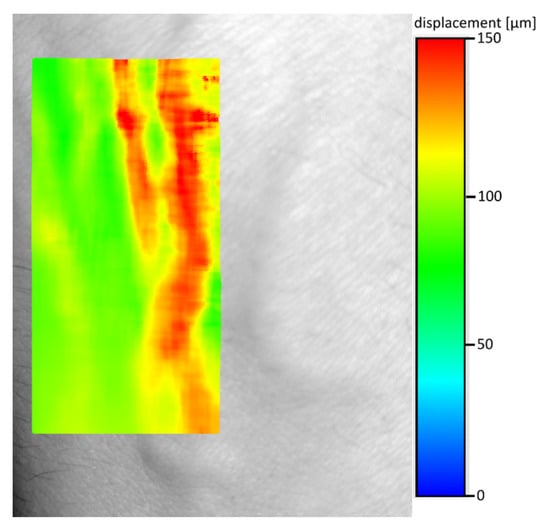 The direct use of the methodology described in the previous chapter gave completely illegible shift maps. This was due to the fact that the limb vibrations were greater several orders of magnitude than the skin movements caused by the change in pressure during the blood flow through the blood vessel (Figure 3). Therefore, the resulting movements map was filtered using average shift calculated from 100 × 300 pixel area without visible veins. Then the calculated vector was subtracted from the shift map (Figure 4). The shifts maps on Figures 4, 6 and 8 are colored according to the absolute shift value, where the minimum shift value is blue and the maximum shift is red. Due to the poor visibility of the vessels at the edges of the hands, filtering using one, fixed shift vector turned out to be insufficient.