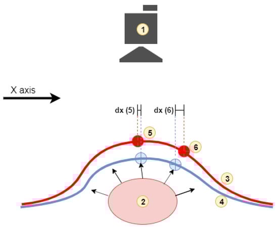 Explaining the mechanism causing visualization of the edges of the arteries (1—camera, 2—artery, 3—skin surface in the max pressure phase, 4—skin surface in the pressure min phase, 5 and 6 selected two points on the skin and their position in the maximum/minimum phase).