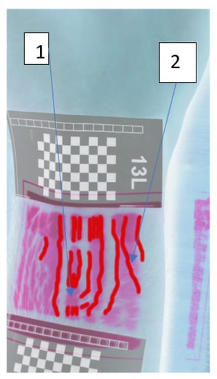 Figure 12 shows cumulative (sum) shifts for 120 frames (movie with 30 FPS, that is, about 4 s of the movie) for 13L participant. Calculation parameters of the map was: a grid of points 400 × 310, the matching area for one point of the grid: 97 pixels. Dark blue places of the image indicate no shift, which means that they indicate the edges of the veins (where the skin does not pulsate). Figure 13 shows reference image with overlaid cumulative shifts from Figure 12. In our opinion, this is the least accurate and legible image of the veins, so based on this image, we created the manually traced edges of the veins detected—Figure 14. Some areas detected as ‘pulsating’ do not coincide with the base (1), and edges of veins not visible in the base were also detected (2).