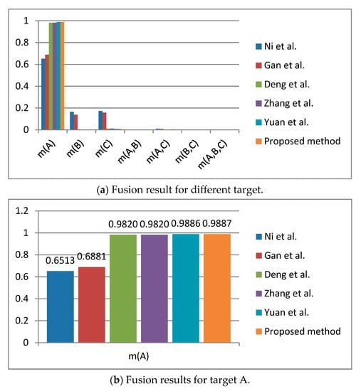 In the proposed method, appropriate data preprocessing is applied before the final data fusion, such as using the Deng entropy to measure the uncertainty of information, which is conducive to the fusion of conflicting data. Therefore, according to the experimental results of this method, even if the second group of evidence has a big conflict with other evidence, we can still infer that A is the correct target, which is in line with our intuition and proves the effectiveness of this method. At the same time, in comparison with other fusion methods, we found that the methods of Ni et al.’s [50] and Gan et al.’s [51] carried out uncertainty measurement and data fusion for the subset of propositions that are not needed for decision-making. The process is more cumbersome and will lead to dispersal of confidence. The method proposed in this paper avoids this problem, makes the fusion result more credible, and facilitates decision-making. Compared with the other methods mentioned, this method takes more uncertainty into account in the process of negation of BPA, which makes the measurement results more accurate.