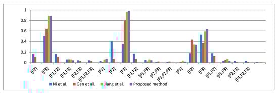 According to Table 11, Table 12, Table 13 and Table 14, the proposed method has consistent diagnostic results with other methods, that is, F2 has the highest confidence at any test frequency. Therefore, the fault diagnosis experiment results show that the fault type is F2, and the effectiveness of the proposed method is also verified. In addition, according to Table 12, Table 13 and Table 14 and Figure 3, we can find that the method proposed in this paper has higher confidence for F2 than the data fusion method proposed in the literature [50,51,54], and it effectively avoids the confidence dispersion existing in the literature [50,51], which leads to the problem that is not conducive to decision making. This is because the proposed method obtains more uncertain information through the negation of BPA, improves the accuracy of information processing, and reduces the loss of information. In addition, this method combines the Deng entropy with the negation BPA, which also ensures the ability to deal with conflicting data.