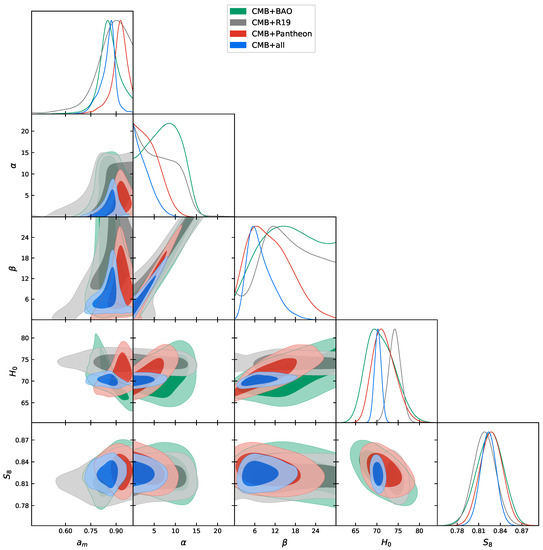 To analyze the data and extract the constraints on these cosmological parameters, we used our modified version of the publicly available Monte Carlo Markov Chain package CosmoMC [94]. This is equipped with a convergence diagnostic based on the Gelman and Rubin statistic [95], assuming , and implements an efficient sampling of the posterior distribution using the fast/slow parameter decorrelations [96]. CosmoMC includes support for the 2018 Planck data release [86] (see http://cosmologist.info/cosmomc/). Finally, since for point , the present model becomes the CDM one, as was already mentioned before, and the likelihood has a singular nature as becomes redundant in this case, we switch back to the unmodified CosmoMC code for the analysis of this point, to avoid problems.