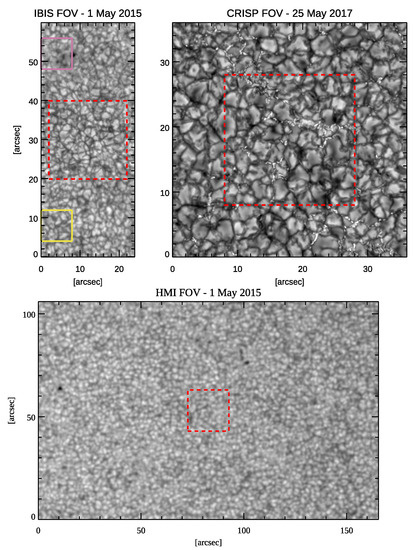 We complemented our analysis with the study of the full-disk observations taken with the Helioseismic and Magnetic Imager (HMI, [72]) instrument on board of the Solar Dynamic Observatory (SDO, [73]) satellite during the IBIS and CRISP observations described above. In particular, we considered continuum filtergrams, Dopplergrams and line-width maps derived from the measurements performed along the Fe I 617.3 nm spectral line every 720 s. We selected a sub-array at the solar disk center, which encompasses an FoV of , as shown in Figure 1 (bottom panel) for HMI data acquired during the IBIS observations. The spatial resolution is of approximately , which corresponds to about 700 km on the photosphere. In this study, we only analyzed two individual temporal frames, one relevant to IBIS observations and the other for the CRISP data.