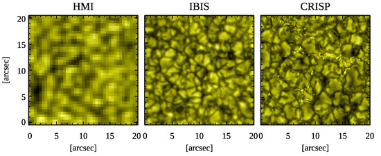In order to better visualize the different spatial resolution of each data set considered in our study, we display in Figure 2 a wide area, cropped at the center of the intensity maps shown in Figure 1. Figure 2 clearly illustrates the increasing spatial resolution from the HMI data set (, left panel), to the IBIS data set (, middle panel), up to the highest resolution in the CRISP data set (, right panel).