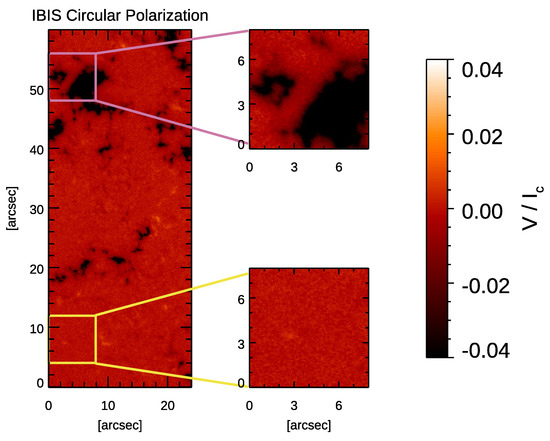 We also analyzed the Stokes V measurements of the IBIS data set to derive the circular polarization (CP) map shown in Figure 3, following the approach of Murabito et al. [65,75]. We used this map to select regions employed to study the influence of small magnetic fields concentrations on the exponents. In particular, we selected two sub-FoVs of (corresponding to pixels) near a small magnetic concentration and a dead-calm (hereafter referred to as quiet) area [76]. These two sub-FoVs are shown in Figure 1 (panel a) by the purple and yellow boxes, respectively, and in Figure 3. They lie at the same distance from the edges of the IBIS FoV in order to have the same correction effect on the image given by the AO system, and consequently a similar spatial resolution.