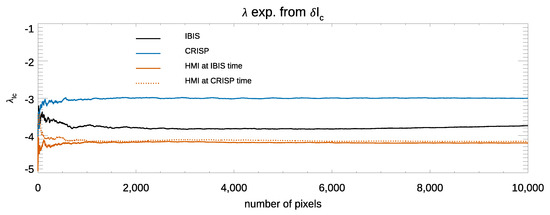 On the other hand, Figure 6 (panel c) shows the exponents obtained from fluctuations. The values of the exponents are between and for the CRISP and HMI data, respectively. Again, the value of the exponent from the CRISP data is higher than that from IBIS observations which, in turn, is higher than the one estimated from the HMI observations. Figure 6 (panel d) shows the exponents evaluated from fluctuations in the CRISP and IBIS data sets. We found a stable convergence of the computed exponents to negative values from both of the analyzed observations. The values of the exponents are and for the CRISP and IBIS data, respectively.