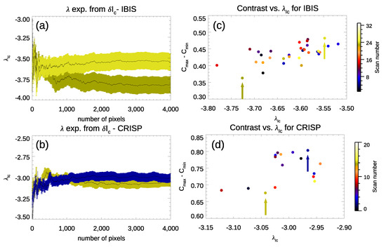 The values of the exponents in Figure 4 differ from each other and depend on the analyzed data set. In order to investigate whether the differences among the computed exponents depend on the diverse spatial resolution of the analyzed observations or other data characteristics, e.g., the variable image contrast C, we analyzed the relationship between the exponents computed in each continuum intensity image of the available IBIS and CRISP observations and their contrast C. Figure 5 (panel a and panel b) shows the variation of the exponents derived from fluctuations in the continuum intensity images characterized by the highest and lowest C values in the IBIS and CRISP series. The dashed areas indicate the uncertainties associated with our estimates in the IBIS and CRISP data sets, which are ±0.1 and ±0.05, respectively. Figure 5 (panel c and panel d) displays a scatter plot between C and values derived from the fluctuations in the IBIS and CRISP data series. The arrows point to the values from the scans with the highest and the lowest C in each series. It can be clearly seen that there is an almost linear relation between the image quality, defined by its contrast C, and the value of the exponent. In our study, we analyzed all the observations available from the two data sets, except for the seeing degraded IBIS scans. However, in the following, we only show results derived from the analysis of the observations characterized by the highest C value in each series. Table 2 summarizes the results obtained.