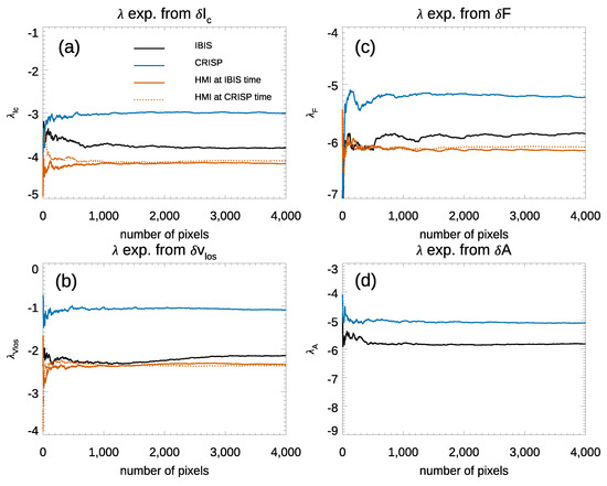 In view of the lack of time series of observations, Hanslmeier and Nesis [60] computed the spatial fluctuations of four parameters derived from the available data and estimated the variation of these fluctuations for increasing samples of data points. In fact, Hanslmeier and Nesis [60] argued that, by virtue of the ergodic condition, the fluctuations of quantities estimated over a large sample of granules are at some time representative of the fluctuations of the same quantities evaluated over a long time interval at a single point of the studied system. However, Hanslmeier and Nesis [60] note that the variation in the quantities estimated in their study are not identical to the Lyapunov exponents that are inherently representative of the temporal evolution of the studied system. Based on that, Hanslmeier and Nesis [60] referred to the exponents considered in their study as to Lyapunov-like exponents (hereafter referred to as ). The four quantities derived from the observations by Hanslmeier and Nesis [60] are: the continuum intensity (), the line-of-sight (LoS) velocity (), the full width at half maximum () and the asymmetry (A) of the spectral lines in their data.