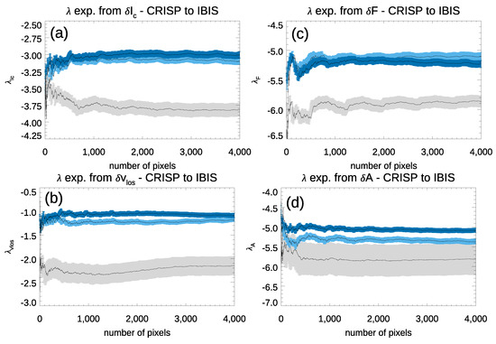 exponents from (panel a), (panel b), (panel c), and (panel d) fluctuations, by considering the highest contrast scans in the IBIS (gray shaded area) and CRISP (blue shaded area) series, and the CRISP degraded data (light blue shaded area). See text for more details.