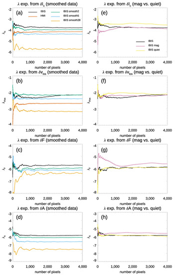 In order to further investigate the dependence of the computed exponents on the spatial resolution of the analyzed data, we performed a spatial degradation of the IBIS observations and repeated our analysis on data affected by different degradation levels. To degrade the observation, we used a smoothing function based on Gaussian kernels. We degraded the maps of the continuum intensity , LoS velocity , line and A derived from the IBIS data to the same spatial scales as used in Hanslmeier and Nesis [60], specifically at the following: