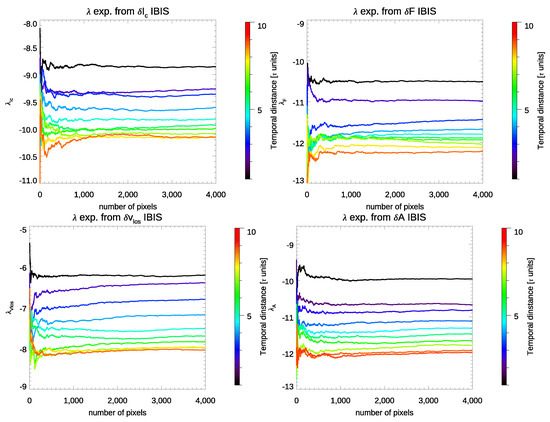 exponents estimated from the residuals of (top left), (bottom left), (top right), and A (bottom right) between maps derived from observations taken at different times. The various colors show results achieved by comparing observations taken at increasing regular time intervals in the time series of IBIS data, expressed in multiples of the temporal cadence (48 s).