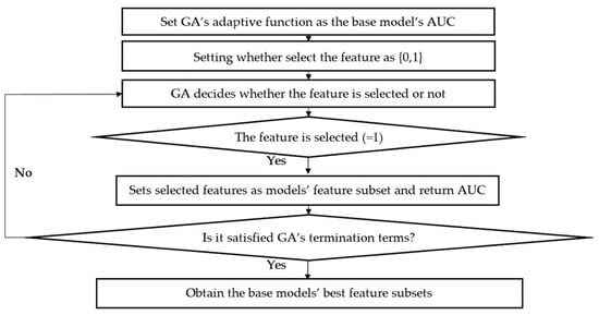 Based on the particle swarm optimization (PSO) feature selection algorithm proposed by Dai and Li [], this paper presents an adaptive feature selection algorithm. Considering that the RFE method only selects features from the perspective of feature importance, it does not take into account the promotion of feature subset on the model’s prediction ability. In this paper, the AUC returned by each base model is used as the adaptive function to be optimized, and the feature selection model is designed by using a genetic algorithm. The specific algorithm flow is shown in Figure 2.