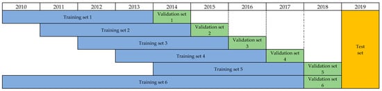 After the design of the adaptive feature selection algorithm, the model uses the instance hardness threshold to process the unbalanced data; LR, SVM, RF, LGB, MLP, and KNN are selected as the base models to be selected, and six sets of datasets are constructed with the sliding window method in Figure 3. Then, 72 combinations () of different models, feature subsets, and datasets are combined with the adaptive feature improvement method to find the corresponding optimal feature subset (AUC is calculated by verification set when the algorithm is applied). Finally, taking 2018′s data as the verification set, the AUC of each combination is obtained, and the formula (1) is constructed (the model with the highest AUC is taken as a reference base).