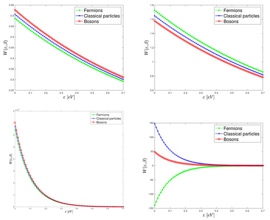 In Figure 1, the Wigner function (18) is plotted versus energy for several values of the parameters and . For comparison, the Maxwell–Boltzmann distribution is also shown. It is important to observe that, at high temperatures, that is, low ’s, the equilibrium Wigner functions for Bosons and Fermions are both close to the Maxwell–Boltzmann distribution; therefore, Bosons and Fermions tend to have the same behaviour for . Moreover, in the plotted cases, the equilibrium Wigner function is positive. At low temperatures (high values of ), the behaviour strongly depends on . When , the equilibrium Wigner functions for Bosons and Fermions are still very close and positive. If , the equilibrium Wigner functions of Bosons and Fermions and the Maxwell–Boltzmann distribution have relevant differences: the most remarkable one is that the Fermions Wigner function is negative while the others are positive.