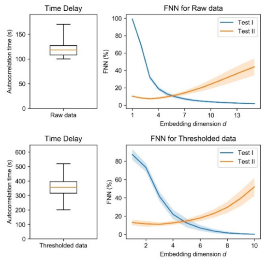- Kennel, M.B.; Brown, R.; Abarbanel, H.D.I. Determining embedding dimension for phase-space reconstruction using a geometrical construction. Phys. Rev. A 1992, 45, 3403–3411. [Google Scholar] [CrossRef]