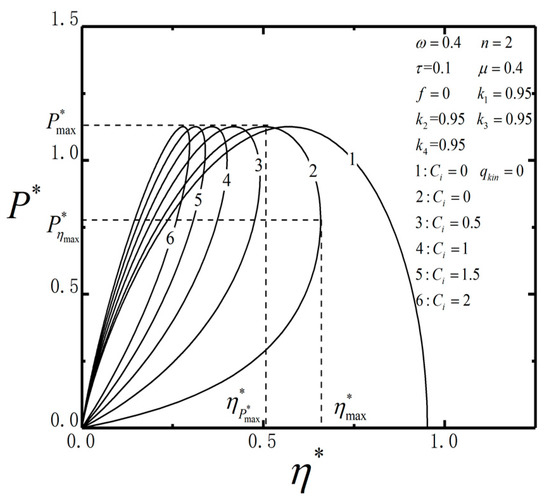 Figure 4 show and characteristics about and with, , , and Ci = 2. It is shown that the performance of the combined TBHE is closely related to the temperature ratio . When and are fixed, and have peaks about . That means that when and are fixed, there is an optimal temperature for the intermediate reservoir to maximize or . Figure 3 and Figure 4 research the characteristics of the and about or with different parameters. Although the shapes of the figures are similar, the values of the corresponding parameters are different when the power and efficiency are maximized. This section studies the performance characteristics of the system operating at maximum power or efficiency and explains the operating principle. Therefore, Figure 3 and Figure 4 show the above shapes.