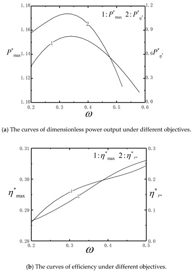 The curves of dimensionless power output and efficiency under different objectives.