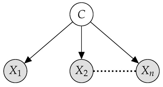 Naive Bayes (NB) models are well-known probabilistic classifiers based on the strong independence hypothesis that, given the class variable, every pair of features is considered conditionally independent [30]. This assumption allows an efficient factorization of the join probability distribution (see Equation (1)) as well as efficient learning and inference procedures. Figure 1 shows the graphical structure of an NB model.