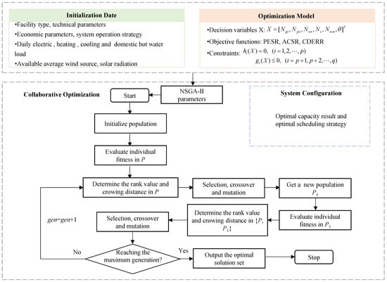 Step 1: Input the initial parameters. Initial parameters include system integration parameters and NSGA-II setting parameters. System parameters are mainly based on facility type, technical parameters, economic parameters, system operation strategy, etc., and are used to establish system thermodynamic, economic, and emission models. The NSGA-II parameters include the size of population (), number of iterations (), crossover’s probabilities and mutation ( and ), and distribution indices of crossover and mutation operations (mu and mum).