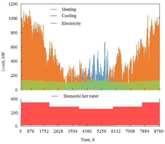 Simulation data of the annual cooling, heating, electric and domestic hot water load of the Harbin hospital.