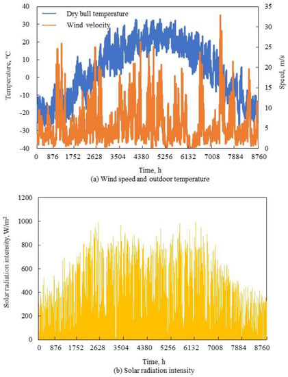 Hourly meteorological data—including air temperature, solar radiation and wind speed—were simulated in DeST [27]. The outdoor environment temperature, wind speed, and solar radiation intensity in this area (shown in Figure 4) were suitable for the development of renewable energy technologies.